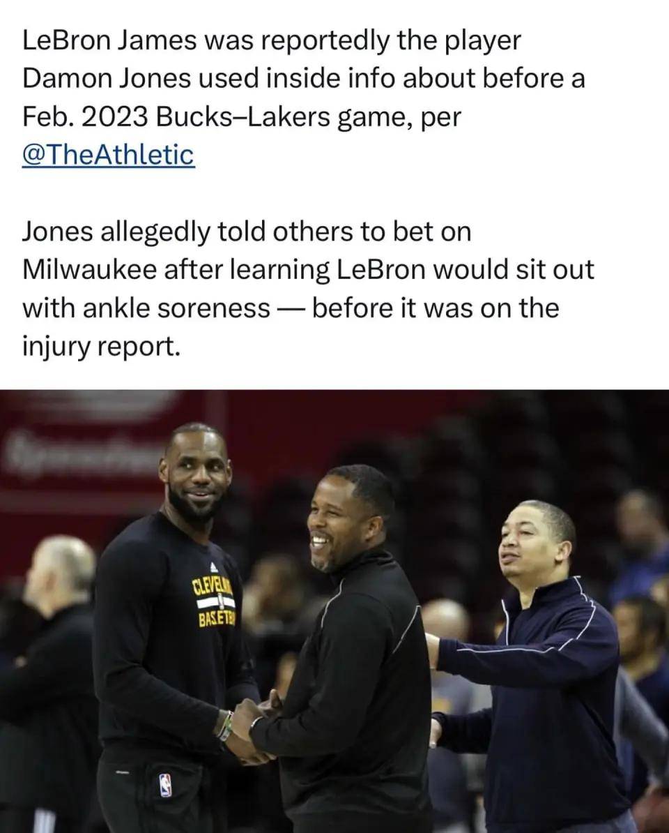 调查显示,已退役的达蒙·琼斯,长期利用其湖人队助教的身份,将球队球星勒布朗·詹姆斯的伤病信息、出场情况等内部情报出售给他人牟利。例如,在2023年一场湖人队比赛前,琼斯事先得知詹姆斯因脚踝酸痛将缺席的消息,立即通知其下线在消息公布前重金押注湖人队的对手雄鹿队,当晚湖人队果然失利。
